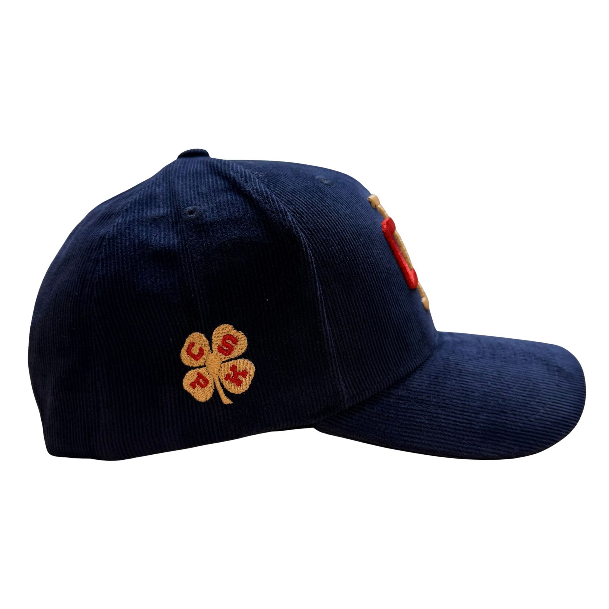 Cappello baseball in 100%velluto di cotone a coste , ricamo frontale CB (Chesapeake’s Bay) e ricamo laterale destro QUADRIFOGLIO .