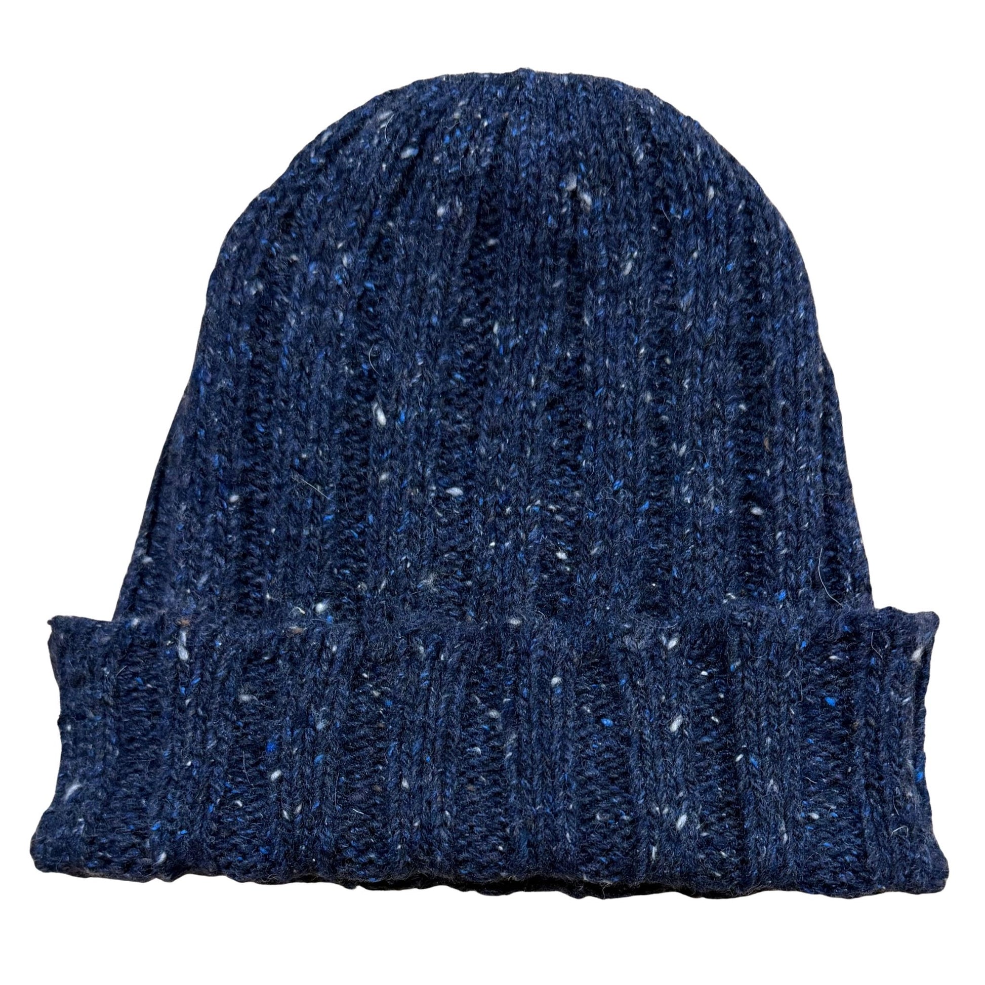 Berretto con lavorazione a coste in finezza 3 realizzata con filato Donegal bottonato.