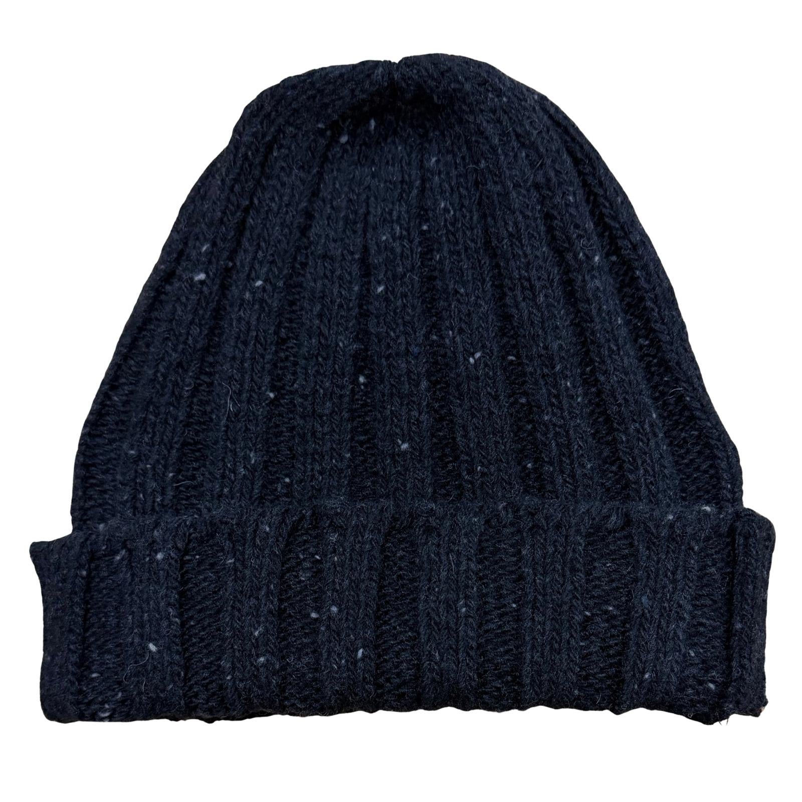 Berretto con lavorazione a coste in finezza 3 realizzata con filato Donegal bottonato.