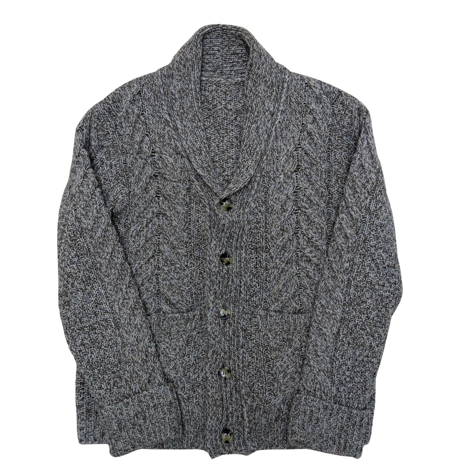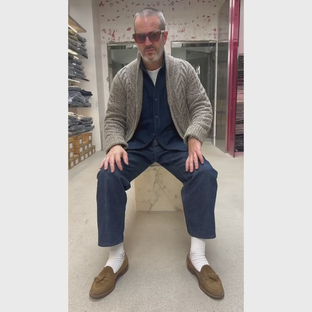 Cardigan collo a scialle lavorazione ARAN realizzato il filato 50% ALPACA e 50% MERINOS SUPERGEELONG.