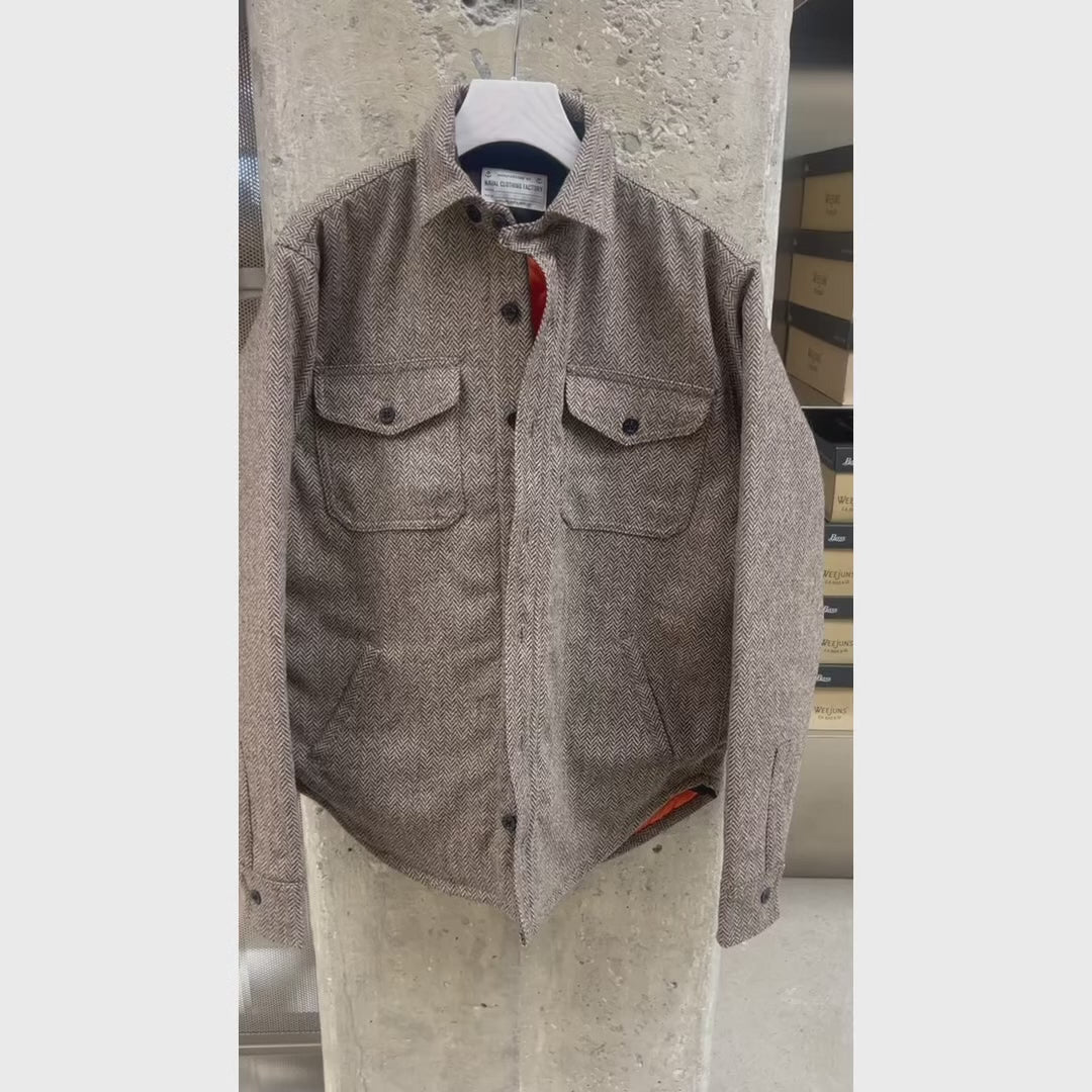 Giacca con collo a camicia, due tasche frontali a toppa con pattine realizzata in tessuto 100%lana vergine tweed spinato.