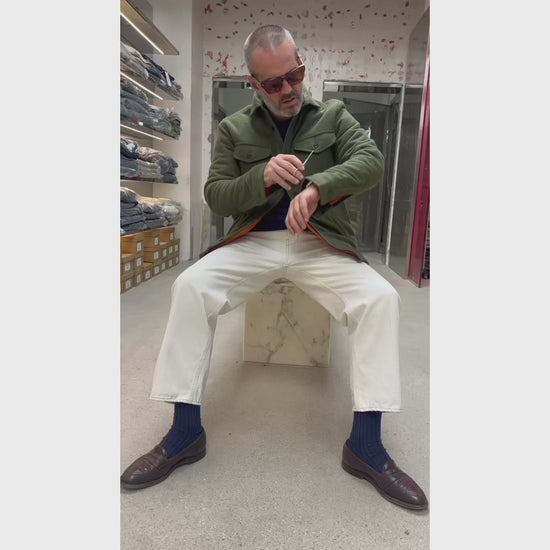 Giacca con collo a camicia, due tasche frontali a toppa con pattine.