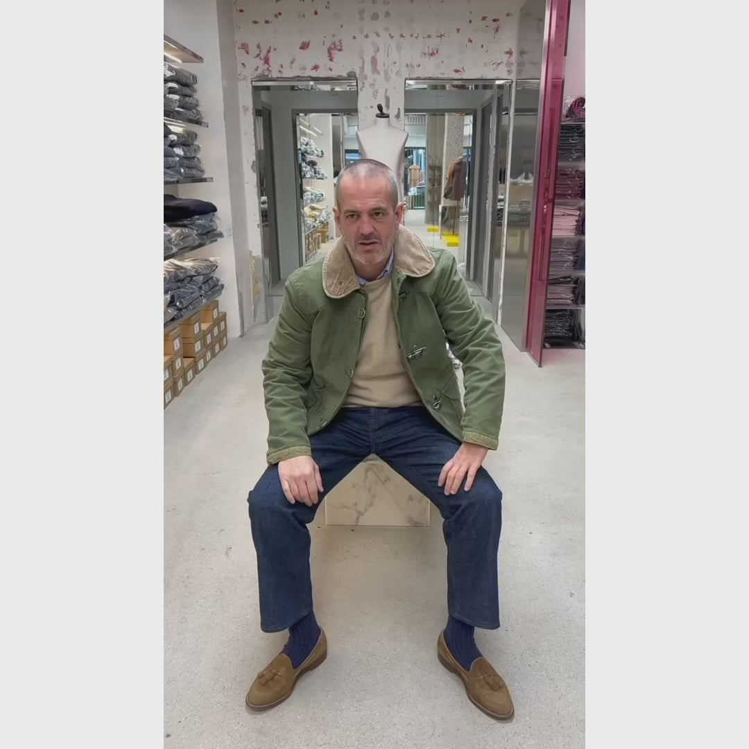 L’iconico 4 Ganci ispirato alle divise dei pompieri americani, è caratterizzato dall’inconfondibile chiusura con ganci in metallo, dettagli in crosta e colletto in velluto.